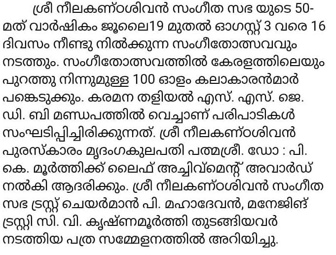 Home City News ശ്രീ നീലകണ്ഠശിവൻ സംഗീത സഭയുടെ 50- മത് വാർഷികവും സുവർണ ജൂബിലി ആഘോഷവും ശ്രീ നീലകണ്ഠശിവൻ സംഗീത സഭയുടെ 50- മത് വാർഷികവും സുവർണ ജൂബിലി ആഘോഷവും Jaya Kesari Jul 16, 2025 0 Comments