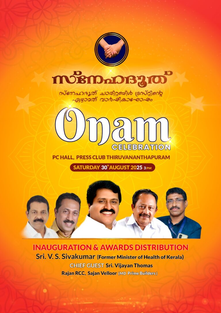 തിരുവനന്തപുരം :- സ്നേഹദൂത്ചാരിറ്റബിൾ ട്രസ്റ്റിന്റെ ഏഴാമത് വാർഷിക ആഘോഷം പ്രസ്സ് ക്ലബ് പി സി ഹാളിൽ 30ന് വൈകുന്നേരം 3മണിക്ക് നടക്കും. ചടങ്ങിൽ മുൻ മന്ത്രി വി എസ് ശിവകുമാർ,രാജൻ ആർ സി സി,സാജൻ വെല്ലൂർ, തുടങ്ങിയ പ്രമുഖർ പങ്കെടുക്കും. വിജയൻ തോമസ് ചടങ്ങിൽ മുഖ്യ അതിഥി ആയിരിക്കും.