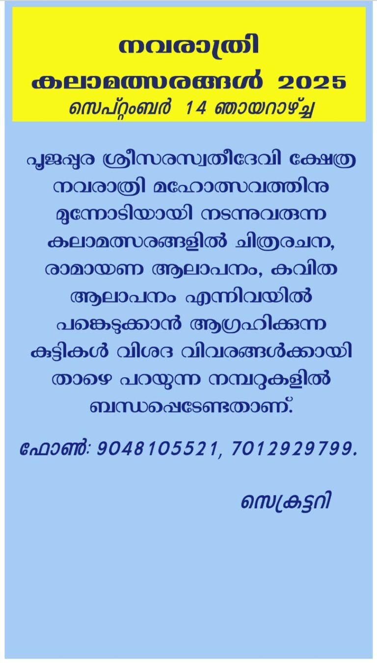 Home City News പൂജപ്പുര മണ്ഡപം സരസ്വതി ദേവി ക്ഷേത്രത്തിലെ നവരാത്രി മഹോത്സവം -കലാ മത്സരങ്ങൾക്ക് അപേക്ഷിക്കാം പൂജപ്പുര മണ്ഡപം സരസ്വതി ദേവി ക്ഷേത്രത്തിലെ നവരാത്രി മഹോത്സവം -കലാ മത്സരങ്ങൾക്ക് അപേക്ഷിക്കാം Jaya Kesari Sep 07, 2025 0 Comments