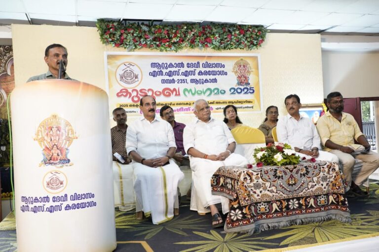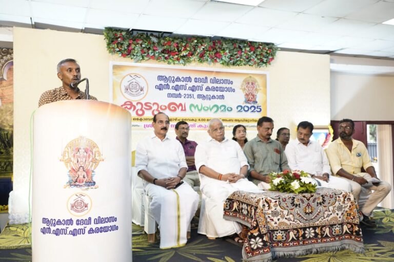 തിരുവനന്തപുരം :- ആറ്റുകാൽ ദേവി വിലാസം എൻ എസ് എസ് കരയോഗത്തിന്റെ ആഭിമുഖ്യത്തിൽ ആറ്റുകാൽ അംബാ ആ ഡിറ്റോറിയത്തിൽ കുടുംബ സംഗമം നടത്തി.സംഗമത്തിന്റെ ഉദ്ഘാടനം എൻ എസ് എസ് വൈസ് പ്രസിഡന്റ് എം സംഗീത് കുമാർ ഭദ്ര ദീപം തെളിയിച്ചു നിർവഹിച്ചു.