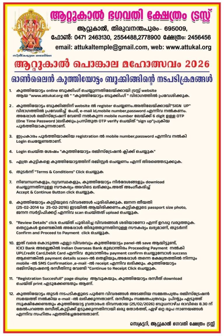 Home City News ആറ്റുകാൽ പൊങ്കാല മഹോത്സവം -2026 ആറ്റുകാൽ പൊങ്കാല മഹോത്സവം -2026 Jaya Kesari Nov 06, 2025 0 Comments