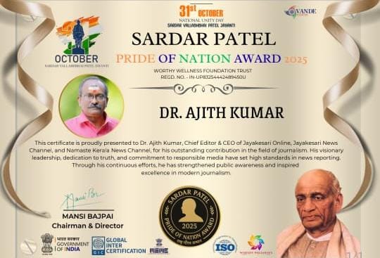 സർദാർ വല്ല ഭായ് പട്ടേൽ ജയന്തിയോട് അനുബന്ധിച്ചു ഏർപ്പെടുത്തിയ സർദാർ പട്ടേൽ പ്രൈഡ് ഓഫ് നാഷണൽ അവാർഡ് 2025,ജയകേസരി ഓൺലൈൻ -ജയകേസരി ന്യൂസ്‌ ചീഫ് എഡിറ്റർ &സി ഈ ഒ ആയ ഡോക്ടർ. ഡി. അജിത്കുമാറിനു ലഭിച്ചു.