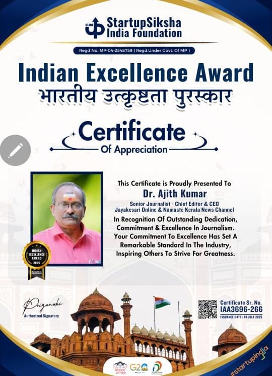 Home City News ഇന്ത്യൻ എക്സലൻസ് അവാർഡ് -2025….ജയകേസരി ചീഫ് എഡിറ്റർ, നമസ്തെ കേരള ന്യൂസ് ചാനൽ സി ഈ ഒ ഡോക്ടർഅജിത്കുമാറിന് ഇന്ത്യൻ എക്സലൻസ് അവാർഡ് -2025….ജയകേസരി ചീഫ് എഡിറ്റർ, നമസ്തെ കേരള ന്യൂസ് ചാനൽ സി ഈ ഒ ഡോക്ടർഅജിത്കുമാറിന് Jaya Kesari Jul 04, 2025 0 Comments Startupsikshaindia foundetion ഏർപ്പെടുത്തിയ മാധ്യമ മേഖലയിലെ ഇന്ത്യൻ എക്സലൻസ് അവാർഡ് -2025 ന് ജയകേസരി ചീഫ് എഡിറ്റർ, നമസ്തെ കേരള ന്യൂസ് ചാനൽ സി ഈ ഒ ഡോക്ടർ അജിത് കുമാർ അർഹനായി