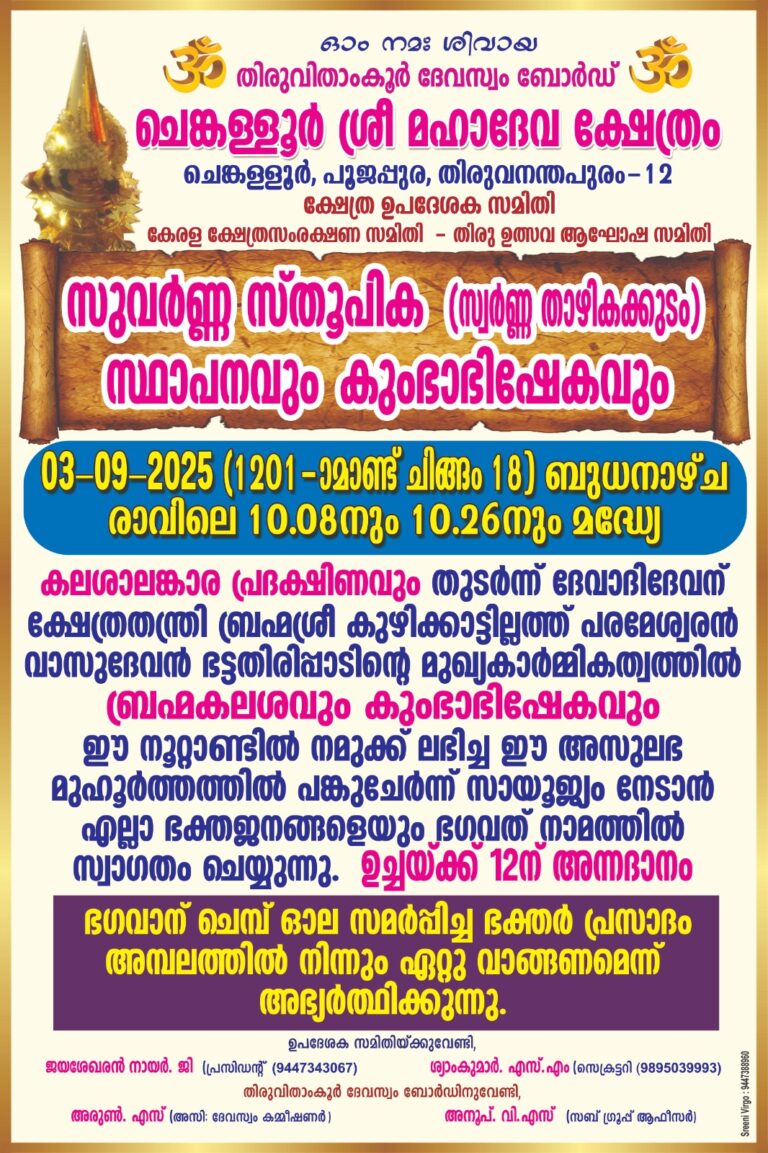 തിരുവനന്തപുരം :- ചരിത്ര പ്രസിദ്ധവും പുണ്യ പുരാതന ശിവ ക്ഷേത്രങ്ങളിൽ ഒന്നായ പൂജപ്പുര ചെങ്കള്ളൂർ ശ്രീ മഹാ ദേവ ക്ഷേത്രത്തിൽ സ്വർണ്ണതാഴികക്കുടം സ്ഥാപനവും, കുംഭാ ഭിഷേകവും സെപ്റ്റംബർ 3ന് ബുധനാഴ്ച രാവിലെ 10മണിക്ക് നടക്കും. കലശഅലങ്കാര പ്രദക്ഷിണവും, തുടർന്നു ബ്രഹ്മ കലശവും, കുംഭഅഭിഷേകവും നടക്കും. ക്ഷേത്രതന്ത്രി ബ്രഹ്മശ്രീ കുഴിക്കാട്ടില്ലത്ത് പരമേശ്വരൻ വാസു ദേവൻ ഭട്ടതിരി പ്പാടിന്റെ മുഖ്യ കാർമികത്വത്തിൽ ആണ് പൂജാദി കർമ്മങ്ങൾ നടത്തുന്നത്. തുടർന്നു അന്നദാനവും ഉണ്ടായിരിക്കും എന്ന് ക്ഷേത്രഉപദേശക സമിതി സെക്രട്ടറി ശ്യാം കുമാർ എസ് എം അറിയിച്ചു. ഈ ക്ഷേത്രത്തിൽ ക്ഷേത്രഉപദേശകസമിതിയുടെ പ്രവർത്തനങ്ങൾ വളരെ മികച്ചതും, ഭക്തർക്ക് ഏറെ അഭിമാനിക്കാമെന്നുള്ളതാണ്. ക്ഷേത്രം ചുറ്റു നടപ്പന്തൽ നിർമാണം ഉൾപ്പെടെ വലിയ വികസനപ്രവർത്തന ങ്ങൾ ആണ് ഇടക്കാലത്തു നടത്തിയിട്ടുള്ളത്എന്നാണ് ഭക്തരുടെ അഭിപ്രായം.