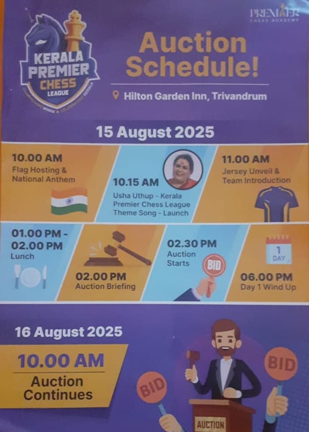 തിരുവനന്തപുരം: പ്രീമിയർ ചെസ്സ് അക്കാദമിയുടെ നേതൃത്വത്തിൽ 2025 സെപ്റ്റംബർ6,7 തീയതികളിൽ ജിമ്മി ജോർജ്ജ് ഇൻഡോർ സ്റ്റേഡിയത്തിൽ നടക്കുന്ന കേരള പ്രീമിയർ ലീഗ് ചെസ്സ് ചാമ്പ്യൻഷിപ്പന് മുന്നോടിയായിട്ടുള്ള ടീം അംഗങ്ങളുടെ തിരഞ്ഞെടുപ്പ് 15, 16 തീയതികളിൽ ഹിൽട്ടൺ ഗാർഡൻ ഇന്നിൽ നടക്കും ഓരോ ടീമിലും 25 പേർ വേണമെന്നിരിക്കെ ആയതിലേക്കുള്ള സെലക്ഷൻ നടപടി ക്രമങ്ങൾ ആണ് 15, 16തീയതികളിൽ നടക്കുന്നത്. ചടങ്ങിൽ കേരള പ്രീമിയർ ചെസ്സ് ചാമ്പ്യൻഷിപ്പിൽ അവതരിപ്പിക്കുന്ന ഉഷാ ഉതുപ്പ് ആലപിച്ച അവതരണ ഗാനത്തിന്റെ ലോഞ്ചിംഗും തെരഞ്ഞെടുക്കപ്പെടുന്ന കായിക താരങ്ങൾക്കുള്ള ജേഴ്സിയെ സംബന്ധിച്ചുള്ളവിവരണവും ഉണ്ടാകും.