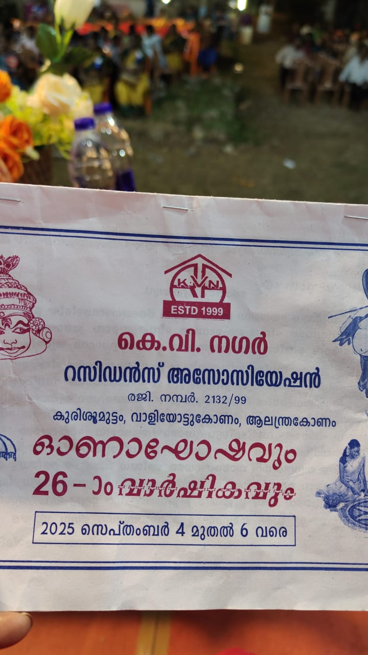 കെ വി നഗർ. കുരിശു മുട്ടം റെസിഡന്റ്‌സ് അസോസിയേഷൻ ഓണം ആഘോഷവും, 26ആമത് വാർഷികത്തിന്റെയും ഉദ്ഘാടനം സ്വാമിനി ടി ടി ഉഷ ഭദ്ര ദീപം തെളിയിച്ചു നിർവഹിക്കുന്നു.