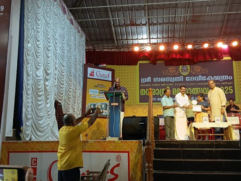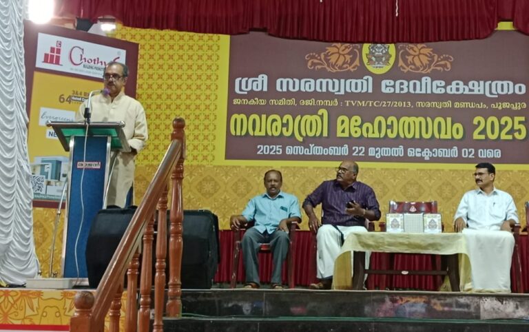 തിരുവനന്തപുരം :-പൂജപ്പുര സരസ്വതി മണ്ഡപം നവരാത്രി ആഘോഷത്തിന്റെ ആറാം ദിനം നവരാത്രി സാഹിത്യ സമ്മേളനത്തിന്റെ ഉദ്ഘാടനം മുൻ ആകാശ വാണി &ദൂരദർശൻ ഡയറക്ടർ എസ് രാധാ കൃഷ്ണൻ നിർവഹിച്ചു. തുടർന്നു പ്രഭാഷണവും നടന്നു. രാധാകൃഷ്ണനെ സരസ്വതിമണ്ഡപം ട്രഷറർ പൊന്നാട യും ഉപഹാരവും നൽകി ആദരിച്ചു. തുടർന്ന് കലാ മാത്സരങ്ങളിൽ വിജയിച്ചവർക്ക് സമ്മാനദാനവും, സർട്ടിഫിക്കറ്റ്,എന്നിവ വിതരണം ചെയ്തു.