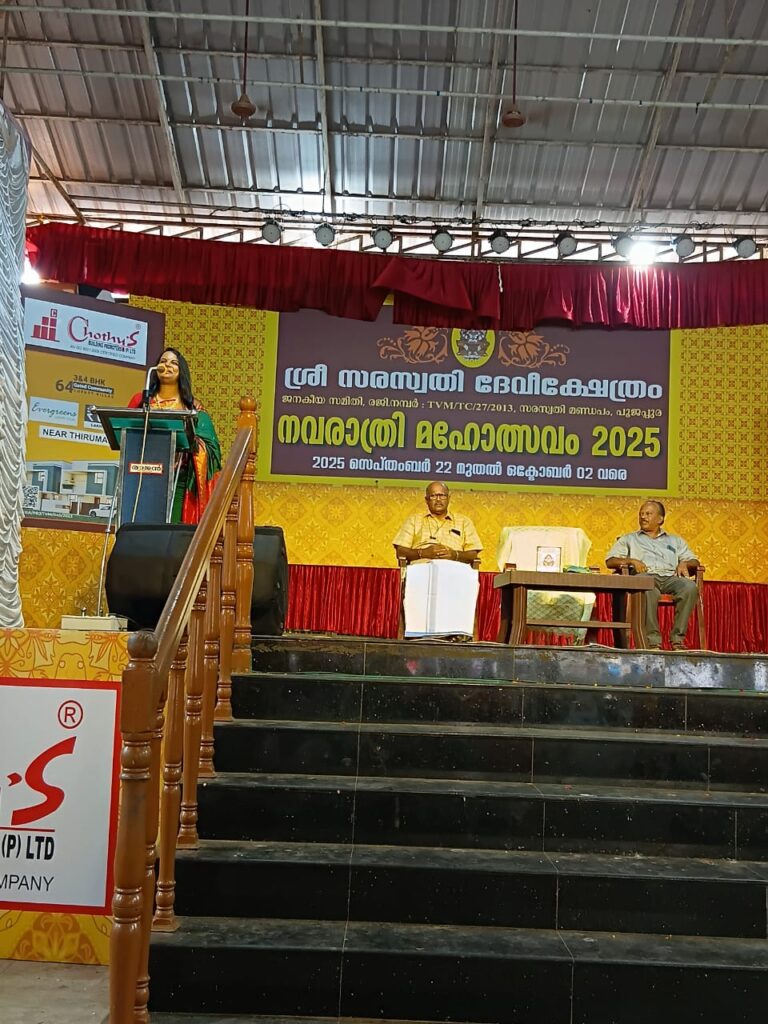 Home City News നവരാത്രി മഹോത്സവത്തിന്റെ എട്ടാം ദിനത്തിൽ നവരാത്രി പ്രഭാഷണപരമ്പര മെന്റൽ പവർ ട്രൈനെർ സുജ ആർ മോഹൻ നടത്തുന്നു. നവരാത്രി മഹോത്സവത്തിന്റെ എട്ടാം ദിനത്തിൽ നവരാത്രി പ്രഭാഷണപരമ്പര മെന്റൽ പവർ ട്രൈനെർ സുജ ആർ മോഹൻ നടത്തുന്നു. Jaya Kesari Sep 29, 2025 0 Comments