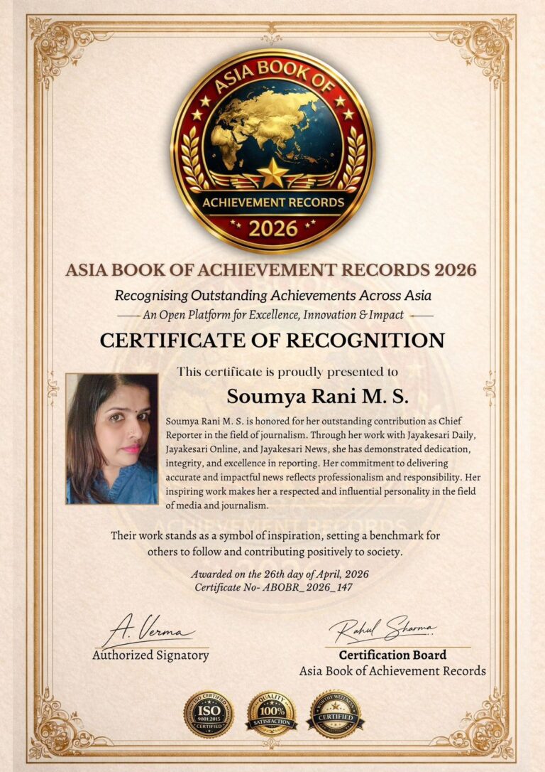 Home City News സൗമ്യ റാണിക്ക് ഏഷ്യബുക്ക് ഓഫ് അച്ചീവ് മെന്റ് അവാർഡ് -2026 സൗമ്യ റാണിക്ക് ഏഷ്യബുക്ക് ഓഫ് അച്ചീവ് മെന്റ് അവാർഡ് -2026 Jaya Kesari Apr 28, 2026 comments off സൗമ്യ റാണിക്ക് ഏഷ്യാബുക്ക് ഓഫ് അച്ചീവ് മെന്റ് റെക്കോർഡ്സ് 2026 അവാർഡ് ലഭിച്ചു. പത്രപ്രവർത്തന രംഗത്തും, സാമൂഹ്യ സേവനരംഗത്തും അവർ നൽകിയിട്ടുള്ള സേവനങ്ങൾ പരിഗണിച്ചാണ് ഈ അവാർഡ്. Post Views: 8