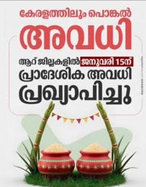 സംസ്ഥാനത്തെ 6 ജില്ലകളില് ഇന്ന് തൈപൊങ്കല് അവധി. തിരുവനന്തപുരം, കൊല്ലം, പത്തനംതിട്ട, ഇടുക്കി, പാലക്കാട്, വയനാട് ജില്ലകളിലാണ് അവധി പ്രഖ്യാപിച്ചിരിക്കുന്നത്.തമിഴ്നാടുമായി അതിര്ത്തി പങ്കിടുന്ന ജില്ലകളിലാണ് പ്രാദേശിക അവധിയുള്ളത്. ഈ ജില്ലകളില് സംസ്ഥാന വൈദ്യുതി ബോര്ഡിന്റെ കാര്യാലയങ്ങള് അവധിയായിരിക്കുമെന്ന് കെഎസ്ഇബിയും അറിയിച്ചിട്ടുണ്ട്. വൈദ്യുതി തടസ്സം ഉണ്ടാകാത്ത രീതിയില് ക്രമീകരണങ്ങള് ഏര്പ്പെടുത്തണം. വൈദ്യുതി തകരാറുണ്ടായാല് ഉടനടി പരിഹരിക്കാന് വേണ്ട മുന്കരുതലുകള് സ്വീകരിച്ചിട്ടുണ്ടെന്ന് ബന്ധപ്പെട്ട എല്ലാ ഫീല്ഡ് ഓഫീസര്മാരും ഉറപ്പ് വരുത്തേണ്ടതാണ്. ക്യാഷ് കൗണ്ടറുകള്ക്കും അവധിയായിരിക്കും. എന്നാല് ഉപഭോക്താക്കള്ക്ക് വിവിധ ഓണ്ലൈന് മാര്ഗ്ഗങ്ങളിലൂടെ പണമടയ്ക്കാന് കഴിയുമെന്നും കെ.എസ്.ഇ.ബി. അറിയിച്ചു.സംസ്ഥാന സര്ക്കാരിന്റെ ഔദ്യോഗിക കലണ്ടര് പ്രകാരമുള്ള അവധിയാണിത്. തമിഴ്നാട്ടിലെ പ്രധാന ആഘോഷമാണ് തൈപ്പൊങ്കല്. തമിഴ്നാട് പൊങ്കലിനോട് അനുബന്ധിച്ച് നീണ്ട അവധിയാണ് പ്രഖ്യാപിച്ചിട്ടുള്ളത്.