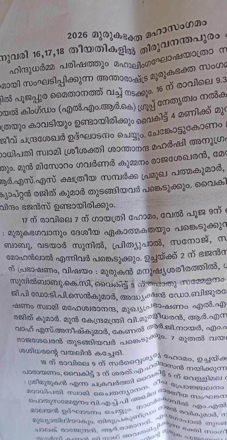 തിരുവനന്തപുരം :- ഹിന്ദു ധർമ്മപരിഷത്തിന്റെ നേതൃത്വത്തിൽ തലസ്ഥാനത്തു പൂജപ്പുരയിൽ ജനുവരി 16,17,18തീയതികളിൽ നടത്തിയ മുരുകഭക്ത മഹാ സംഗമം വിവാദത്തിലേക്ക്. നഗരസഭയെ നോക്ക് കുത്തിയാക്കി ടിക്കറ്റ് വച്ച് ലക്ഷങ്ങൾ പിരിച്ചെടുത്ത് വൻ തട്ടിപ്പ് നടത്തിയിരിക്കുന്നതയാണ് ആരോപണം ആയി ഉയർന്നിരുക്കുന്നത്.ഹിന്ദുധർമ്മ പരിഷത്ത് പ്രസിഡന്റു എം ഗോപാലന്റെ നേതൃത്വത്തിൽ ആണ് തലസ്താ നത്ത് മുരുകഭക്ത സംഗമം നടത്താൻ പരിപാടി യിട്ടത്.മഹാ ലിംഗ ഘോഷയാത്ര സമിതിയുടെ പേര് കൂടിവെച്ചാണ് ഗോപാലൻ ഇത്തരമൊരു സംഗമത്തിന് തുടക്കം കുറിച്ചത്. മുരുകഭക്ത സംഗമം നടത്തുന്നതിനായി ചെയർമാൻ ഡോ. പി രാധാ കൃഷ്ണൻ നായർ, ജനറൽ കൺവീനർ ആയി അജിത് ശംഖു ചക്രം, ഫിനാൻസ് കമ്മിറ്റി ചെയർ മാനായി സുനിൽ കുമാറിനെയും കൂട്ടി യാണ് പരിപാടികൾ നോട്ടീസ് പ്രിന്റ് ചെയ്തു ഇറക്കിയത്. നഗര സഭയിൽ ഹിന്ദു ധർമ്മപരിഷത്തിന്റെ പേരിൽ പൂജപ്പുര ഗ്രൗണ്ടും, മൈതാനവും 21.10 25തീയതിയിൽ ബുക്ക് ചെയ്തു എന്നതൊഴിച്ചാൽ മുരുകഭക്ത സംഗമവും ആയി ബന്ധപെട്ടു ടിക്കെറ്റ്നിരക്കിലാണോ പരിപാടികൾ നടത്തുന്നത്, നടത്തുന്ന പരിപാടികളുടെ മുഴുവൻ വിവരങ്ങളും നഗരസഭയെ ഇവർ രേഖമൂലം അറിയിച്ചിട്ടില്ല എന്നുള്ളത് നഗര സഭ നൽകിയ വിവരഅവകാശത്തിൽ അറിയിച്ചിട്ടുണ്ട്. കൂടാതെ അവിടെ 3ദിവസങ്ങളിലും നടന്ന മെഗാ പരിപാടികളിൽ 500,1000രൂപയുടെ പ്രവേശന ടിക്കെറ്റുകൾ വച്ചാണ് നടത്തിയിട്ടുള്ളത്. മിക്ക ടിക്കെറ്റുകളിലും ഹിന്ദു ധർമ്മപരിഷത്തിന്റെ സീൽ പതിപ്പിച്ചിട്ടുട്ടെ ങ്കിലും, അതിലും കൂടുതൽ ടിക്കെറ്റുകൾ വിറ്റിട്ടുള്ളത് ആരുടെയും സീൽ പതിപ്പിക്കാതെ ആണെന്ന് കണ്ടെത്തിയിട്ടുണ്ട്. എന്റർടൈൻമെന്റ് പരിപാടി ടിക്കറ്റ് വച്ചാണ് നടത്തുന്നത് എങ്കിൽ നഗരസഭയെ ആ വിവരം അറിയിക്കുകയും, ടിക്ക്വറ്റുകൾ നഗരസഭസീൽ ചെയ്തു ടാക്സ് ഈ ടാ ക്കി മാത്രമേ നടത്താവൂ എന്നാണ് നിയമം. എന്നാൽ എല്ലാ നിയമങ്ങളും കാറ്റിൽ പറത്തി ഇവർ പരിപാടി നടത്തുകയും ലക്ഷങ്ങൾ ടാക്സ് അടക്കാതെ തട്ടിപ്പ് നടത്തിയിരിക്കുകയുമാണ്. ഇത് സംബന്ധിച്ചു നഗര സഭയുടെ റവന്യു വിഭാഗം മുരുകഭക്ത സംഗമം നടത്തിയ വർക്ക് നോട്ടീസ് നൽകി മുഴുവൻ ടിക്കെട്ടുകളുടെയും കൗണ്ടർ ഫോയിൽ നഗരസഭയിൽ സമർപ്പിച്ചു ഓരോ ടിക്കെറ്റി നും 10%നികുതി അടക്കണം എന്ന് നോട്ടീസ് കൊടുത്തെങ്കിലും ഇതുമായി ബന്ധപ്പെട്ട തട്ടിപ്പ് വീരന്മാർ ഒരു രൂപ പോലും അടക്കാതെ മുങ്ങുക ആണ് ഉണ്ടായിരിക്കുന്നത്. ഈ പരിപാടി അസൂത്രണം ചെയ്ത ഹിന്ദു ധർമ്മപരിഷത്ത് പ്രസിഡന്റ് എം ഗോപാൽ വലിയശാല ഉള്ള ഡിക്സ്ട്രിക്ട് ഫാം ടൂർ കോ ഓപ്പറേറ്റീവ് സൊസൈറ്റി എന്നസ്ഥാപനത്തിൽ 10,65,000രൂപയുടെ ഇടപെടുമായി ബന്ധപ്പെട്ട കേസിൽ തമ്പാനൂർ പോലീസ് ക്രൈം 1546/2025,വകുപ്പുകൾ 316(2),318(4),3(5) എന്നുള്ള ക്രൈം കേസിൽ ജാമ്യം എടുത്തു നിൽക്കുന്ന വ്യക