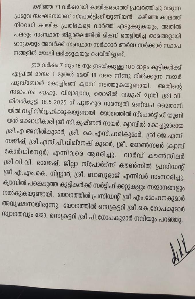 Home City News പൂജപ്പുര സ്പോർട്ടിംഗ് യൂണിയൻ സമ്മർ ഫുഡ് ബോൾ കോച്ചിംഗ് ക്യാമ്പിൻ്റെ സമാപന സമ്മേളനം ഉദ്ഘാടനം ചെയ്തു പൂജപ്പുര സ്പോർട്ടിംഗ് യൂണിയൻ സമ്മർ ഫുഡ് ബോൾ കോച്ചിംഗ് ക്യാമ്പിൻ്റെ സമാപന സമ്മേളനം ഉദ്ഘാടനം ചെയ്തു Jaya Kesari May 19, 2025 0 Comments