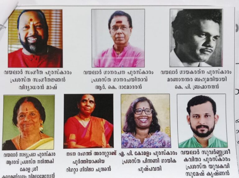 വയലാർ രാമവർമ്മയുടെ 50-ആമത് ചരമവാർഷികത്തോട് അനുബന്ധിച്ചു വയലാർ രാമ വർമ്മ സാംസ്‌കാരിക സമിതി യുടെ ആഭി മുഖ്യ ത്തിൽ ഒക്ടോബർ 18മുതൽ 27വരെ പുത്തരിക്കണ്ടം ഈ കെ നയനാർ പാർക്കിൽ നടക്കുന്ന ചടങ്ങിൽ വയലാർ രാമവർമ്മ സ്മൃതി വർഷപുരസ്‌കാരം വിദ്യാധ രൻ മാഷിന് നൽകും. 11,111രൂപയും, ഫലകവും, പ്രശസ്തി പത്രവും അടങ്ങുന്നതാണ് അവാർഡ്. വയലാർ ഗാന രചന പുരസ്‌കാരം ആർ കെ ദാമോദരനും, വയലാർ ഗായകരത്ന പുരസ്‌കാരം മരണാ നന്ദ ബഹുമതി ആയി കെ പി ബ്രഹ്മാനന്തനും, വയലാർ നാട്യ പ്രഭാപുരസ്‌ക്കാ ര ആദരവ് കലാ മണ്ഡലം വിമലാ മേനോനും, എ പി കോമളം പുരസ്‌കാരം പുഷ്പവതിക്കും നൽകി ആദരിക്കും. നടനരംഗത്തുഅര നൂറ്റാണ്ടു പൂർത്തിയാക്കിയ റിഗാ റ്റ ഗിരിജ ചന്ദ്രനെയും, വയലാർ സുവർണ്ണ ശ്രീ കവിത പുരസ്‌കാരം യുവ കവി സുമേഷ് കൃഷ്ണനും നൽകും. ആഘോഷകമ്മിറ്റി ചെയർമാൻ മുക്കം പാലമൂട് രാധാ കൃഷ്ണൻ, ഗോപൻ ശാസ്‌ത മംഗലം, അഡ്വക്കേറ്റ് കെ ചന്ദ്രിക, ജി വിജയകുമാർ, ഗോപൻ ശാസ്ത മംഗലം, ജയശ്രീ ഗോപാലകൃഷ്ണൻ തുടങ്ങിയവർ അടങ്ങുന്ന സമിതി ഭാരവാഹികൾ ആണ് ഇക്കാര്യം അറിയിച്ചത്.